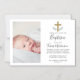 Este convite simples e moderno apresenta as folhas de aquarela eucalipto com uma tipografia de cor dourada e escrita manual. Esta tenda design rustica inclui a sua fotografia, e é perfeita para a ocasião religiosa cristã de um batismo infantil.