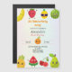 Prepare-se para uma celebração fresca! Este convite de aniversário temático de frutas está repleto de cores suculentas e charme lúdico — perfeito para o grande dia do seu pequeno. Com ilustrações adoráveis de morangos sorridentes, limões zesty e muito mais, este cartão define o tom para uma festa fresca e divertida.