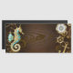 Fundo de madeira castanho com fundo marinho, cordilheira mecânica, volante antigo, âncora de ouro e diversas engrenagens de ouro e latão. Estilo Steampunk.
