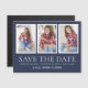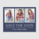 Cartão de Imã salve a data de graduação de fotos moderno e moderno 4 para a Classe 2022 ou qualquer ano. A frente do cartão tem 3 fotos favoritas em um fundo azul-marinho (cor personalizável), "Salvar a data", seu nome, nome da escola, ano de graduação, data de graduação e local.