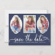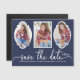 Placa de Imã salve a data de graduação de fotos moderna e moderna 4. Este cartão tem 3 quadros brancos bonitos e giros com fotos favoritas em um fundo azul-marinho (cor personalizável), mensagem "Salvar a data" em uma fonte de caligrafia divertida, e seu nome, escola, classe e data de graduação.