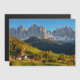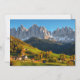 cartão com fotos magnético da pequena aldeia Sankt Magdalena, com a proeminente igreja cercada de árvores de cor no outono, em frente aos picos altos da montanha Dolomites, na última luz do dia no vale de Villnöss (Funes), no sul do Tirol, Itália.