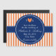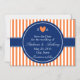 O design apresenta um padrão de listras alternadas laranja e branco no fundo. Além disso, o design apresenta as iniciais da noiva e do noivo separadas por um coração laranja. Um padrão listrado elegante e no meio há um círculo azul real onde se adiciona o seu texto. Cartões-postais de casamento para salvar a data.