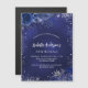 Um fundo azul marinho, decorado com falso brilho prateado, faíscas e flores azuis. A cor azul é irregular. Personalize e adicione um nome e detalhes da parte.