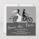 Bela Bicicleta Tandem e Casamento magnético Groom salvam o cartão de encontro em tons de cinza com uma noiva em um vestido de noiva com um pequeno coração vermelho no véu e um noivo em seu terno... um convite de casamento personalizado espantoso... adicione seu próprio texto... produtos de casamento de designer por Ricaso