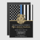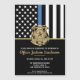 Este design apresenta uma bandeira da polícia com listras pretas e brancas, e uma fina faixa azul de linha também. O crachá da polícia e o texto do ouro estão acima de todos os detalhes do partido para os detalhes do polícia aposentado, xerife, capitão ou chefe do partido aposentado.