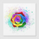 Rosa grande e florescente com pétalas arco-íris sobre fundo branco, pintadas com pedaços de tinta colorida e brilhante. 3d