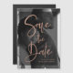 Estes casamento modernos e elegantes salvam a data em que os cartões magnéticos exibem sua própria foto pessoal cobrindo completamente o fundo. Uma camada preta contém tipografia de trendy rosa dourada falsa. Um brilho, na moda, olhe seus hóspedes vão amar!