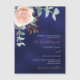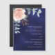 Um fundo azul marinho colorido. A cor azul é irregular. Decorados com ouro-rosa e folhas de eucalipto cor-de-rosa-esbranquiçada, flores de rosa e cor-de-rosa-esbranquiçada, galhos, verde-verde e um cinzeiro de ouro falso. Personalize e adicione seus nomes e detalhes. Texto branco e ouro.