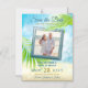 Anuncie seu dia especial com esta brilhante e alegre design evocando uma praia ouro com céu azul e luzes de galho, decorada por novas folhas verdes de palmeiras. Substitua a foto da amostra pelo seu próprio dentro, o quadro de madeira azul. Perfeito para casamentos de praia, casamentos de destino, casamentos tropicais, casamentos insulares, casamentos de Verão e outros locais relacionados com o mar. Visite a coleção para ver a suíte inteira.