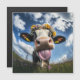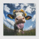 Uma imagem lúdica e aproximada de uma vaca em um prado ensolarado, adornada com uma coroa floral vibrante feita de margaridas e flores silvestres. A vaca põe a língua para fora, acrescentando um toque de humor e charme à cena. O céu azul brilhante e as nuvens suaves no fundo aumentam ainda mais a alegria e caprichosa sensação da imagem.