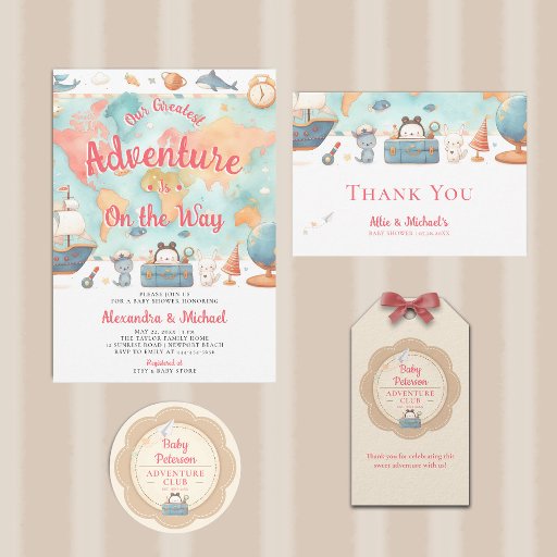 Um belo convite de chá de fraldas feminino que é neutro em gênero, com tema de viagem e aventura, com ilustração aquarela do mapa mundial com caracteres bonitos e elementos relacionados a viagem, com o título "Nossa Maior aventura está a caminho". Perfeito para futuros pais que amam viagem, que adoram o tema da aventura para um chá de fraldas.