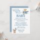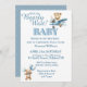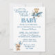 Personalize este convite de chá de bebê de urso teddy fofo com suas próprias palavras usando o botão personalizar. O convite apresenta um adorável ursinho de pelúcia voando em um avião azul. Outro ursinho está segurando balões no canto inferior esquerdo. O verso é azul com bolinhas brancas.