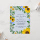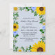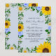 Convite rústico do Dia das Mães country com girassóis vibrantes, margaridas brancas tradicionais e flores azuis coloridas contra um fundo azul poeirento claro com sapatos de bebê e acentos de verde botânico