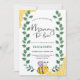 Convite para chá de fraldas, com tema de abelhas, honrando a mamãe! Design apresenta pentes de mel amarelo e dourado e Eucalyptus com ilustração de abelhas. Personalize com suas informações ou clique em "Clique para personalizar mais" para editar estilos de fonte, tamanho e cores.
