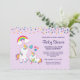 Um convite de chá de bebê com uma mamãe unicórnio branca com cauda e juba coloridas e extravagantes. Um bebê unicórnio deitado ao lado dela, com uma chupeta verde na boca. Um arco-íris colorido com nuvens fofas, e algumas estrelas e coração decoram este design doce e adorável. Um contorno rosa ousado ao redor da imagem dá a ela um visual de desenho infantil. Pontos de confete ao longo do topo.
