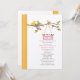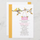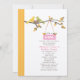 Um convite ao chá de fraldas moderno, com a ilustração de uma ave mamãe amarela, com uma ave pai verde, empoleirada num ramo de árvore com folhas de outono. Os pássaros estão vigiando o ninho, que segura um ovo rosa. Borda laranja com pontos brancos à esquerda. Personalize o texto com detalhes da sua ocasião.