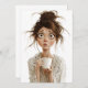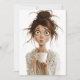 A imagem retrata uma ilustração exagerada, caprichosa, do estilo cartoon de uma mulher com olhos largos e assustados, cabelos roçados em um pão bagunçado e sardas. Ela parece descascada e confusa, segurando uma caneca de café branca em ambas as mãos enquanto veste um manto leve com um padrão floral. Sua expressão sugere que ela está chocada ou sobrecarregada, possivelmente depois de acordar ou experimentar um momento caótico. As características exageradas, em especial seus grandes olhos e rosto fino e expressivo, acrescentam um tom humorístico e relativo à cena.