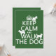 Este é o poster clássico da guerra "mantem a calma e continua" reformulado "mantem a calma e anda o cão". Há silhuetas dos cães que estão e que sentam-se e em torno das palavras. O design faz grandes presentes ou presentes para proprietários do cão/amantes, ou enquanto um obrigado você para canis/veterinários/salvamento se centra e caminhantes do cão.