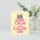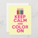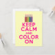Mantenha a calma e a cor ligada. Relaxe por coloração com lápis de cor, lápis de cor e pastéis. O rosa mantém a letra calma sobre um fundo amarelo claro com um conjunto de lápis coloridos no topo. Convite para festas de arte!