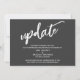 A distinção deste conjunto deve-se à fonte moderna, escrita à mão, utilizada para frases de sotaque. Se precisar avisar seus hóspedes que seu casamento foi cancelado, este cartão oferece uma opção ousada e atraente. Nesta peça, a fonte de script com letra manuscrita foi usada para criar um gráfico simples que mostrava a palavra "atualização". Use os campos modelo para adicionar seus detalhes pessoais e tornar este design único e moderno seu próprio. O fundo sólido pode ser alterado para qualquer cor que você preferir. Por favor, responda a quaisquer solicitações especiais ou personalize a assistência. 100 //