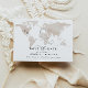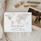 Esta opção de salvar a data apresenta um mapa do mundo da cor d'água bege, uma combinação simples de fontes e uma foto opcional no verso com um espaço para o seu site de casamento. Esta data salva é perfeita para o seu viagem, destino ou aventura casamento ou evento temático. Para alterar o local do coração, role para baixo na seção de personalização e selecione a opção azul 'clique para personalizar mais'.
