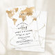 Planejando o casamento no destino romântico? Convide seus convidados com este belo convite com mapa mundial dourado e seu destino personalizado marcado com o coração móvel.