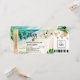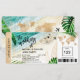 Convite de Casamento com Passagem Aérea para Destino de Ilha Tropical com Corações e Ícone de Avião com Folhas Tropicais