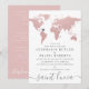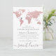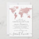 Convite de casamento de destino com mapa-múndi cor-de-rosa discreto com marcador de localização em forma de coração que pode ser movido para marcar a localização do casamento e criar um convite elegante com tema de viagem cor-de-rosa e cinza para uma recepção local em casa ou casamento de destino.