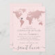Mapa-múndi rosa bege e dourado-rosado com marcador de localização de mapa em formato de coração editável tema de viagem para convite de recepção local ou casamento em destino.