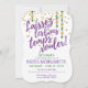 Que os bons tempos rolem! Este convite colorido ostenta um tema festivo de Mardi Gras. Uma tipografia divertida em letra cursiva com brilho roxo falso escreve as palavras 'Laissez Les Bons Temps Rouler' (Deixem os bons tempos rolarem) acentuadas por confetes com aparência de brilho dourado e cordões de contas nas cores roxo, verde e dourado. Personalize a frente com os detalhes da sua festa usando os modelos de texto fornecidos. O verso é impresso com um padrão harlequim em tons de roxo e é acentuado com uma flor-de-lis dourada. Visite minha loja para outros acessórios de festa combinando.