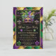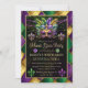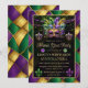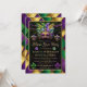 Design de Mascarada de Gras Douradas, Roxas e Verdes Elegantes, com máscara de carnaval, luzes e diamantes com fundo abstrato.