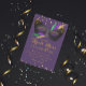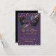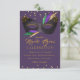 Mardi Gras Costume Party com máscara decorada em roxo verde e penas de ouro; todo o texto é editável para o seu evento.