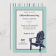 Esses convites personalizados são perfeitos para festas de aposentadoria, festas de aniversário e muito mais. Eles apresentam uma ilustração de uma cadeira de Adirondack de madeira em azul marinho contra um fundo azul-aqua claro e branco de casca-de-ovo. Os convites para a tela plana estão prontos para serem personalizados com todos os detalhes de sua festa em marinho azul. O verso tem um padrão de faixas de coordenação.