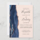 A borda esquerda deste elegante convite de casamento moderno apresenta um marinho azul de aquarela agate bordado com falso brilho rosa de ouro. O texto personalizável combina o script de escrita manual preto de ardósias com fontes em itálico e em copperplate em um fundo cor-de-rosa pincelado. O verso fornece espaço para detalhes do casamento em um fundo sólido de blush, junto com um código QR que os convidados podem digitalizar para visitar seu site e RSVP, o que economiza o custo de imprimir e enviar cartas RSVP separadas.