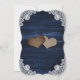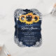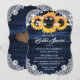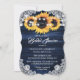 Belos convites de chá de panela rústicos de marinho azul e girassol com flores de girassol e rendas florais brancas contra fundo de madeira rústica. Itens correspondentes disponíveis.