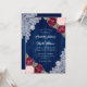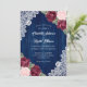 Elegante marinho rústico azul, burgundy e blush convite para casamento floral com rosas borrifadas e cor-de-rosa escamoteadas sobre um fundo de madeira azul-marinho enfeitado com rendas florais brancas. Design de cartão perfeito para convidar os seus convidados para a sua festa de casamento azul marinho, burgundy e blush rustic. Itens correspondentes disponíveis.