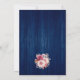 Convite de casamento floral, azul-marinho e azul-rústico, com buquê de dahlias entupidas e dahlias-reluzentes e dentro-verde-mason contra um fundo de madeira azul-celeiro adornado com rendas florais brancas e luzes de cordas. Design de cartão perfeito para convidar seus convidados para o marinho azul e para a festa de casamento rústica.