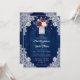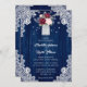 Azul marinho russo, burlu e blush convite floral de casamento apresentando um buquê de rosas e flores de hálito de bebê dentro a mason jar contra um fundo de madeira de celeiro adornado com rendas florais brancas e luzes de cordas. Design de cartão perfeito para convidar os seus convidados para a sua festa de casamento azul marinho, burgundy e blush rustic. Personalize facilmente este convite de casamento com os seus detalhes de casamento online. Design totalmente personalizável. Itens correspondentes disponíveis.