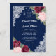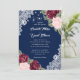 Elegante marinho rústico azul, burgundy e blush convite de casamento apresentando lindas flores aquáticas contra uma burlap e fundo de renda decorado com luzes de cordas. Os detalhes de casamento são escritos em uma letra na moda.