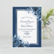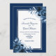 Na frente: um fundo azul marinho com uma simples trama escura e branca. Decorado com flores azuis, rosas. Modelos para seus nomes e detalhes do casamento. Os nomes são escritos com um script de estilo manuscrito, letras azuis. Traseira: fundo Marinho azul colorido.