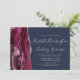 A borda esquerda deste elegante convite de casamento moderno apresenta uma corda d'água borrifada com borda cortada com falso brilho prateado. O texto personalizável combina escrita manual, impressão e fontes itálicas em cinzas prateadas em um fundo azul marinho. O lado inverso apresenta um design de burgundy e agate prateado.