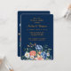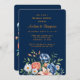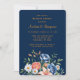 Uma ilustração aquosa de um buquê de pénia brilhante em azul marinho e laranja. O buquê consiste de peônias com flores grandes e redondas e folhas verdes profundas. O fundo é marinho azul. Convites e material de casamento correspondentes estão disponíveis neste conjunto de coleções