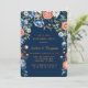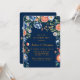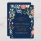 Uma ilustração aquosa de um buquê de pénia brilhante em azul marinho e laranja. O buquê consiste de peônias com flores grandes e redondas e folhas verdes profundas. O fundo é marinho azul. Convites e material de casamento correspondentes estão disponíveis neste conjunto de coleções