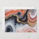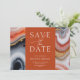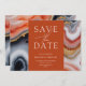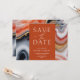 Guarde contemporaneamente o convite de data que contém um quadrado laranja no qual todas as suas informações são escritas elegantemente num fundo mármore abstrato agate. Os detalhes agados estão em tons de laranja e azul com sotaques dourados. Veja na nossa loja mais itens desta coleção de casamento.