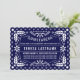 papel azul e branco marinho picado Quinceañera 15.o aniversário. Este convite ao estilo popular mexicano traz flores brancas e folhas sobre fundo azul escuro.