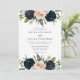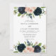 Convite de casamento com o tipo elegante e florais de cor d'água no topo e no fundo. As cores incluem marinho azul-da-meia-noite, rosa de pincel, branco e amplo verde.