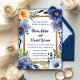 Este convite para o casamento apresenta uma elegante estrutura floral com flores azuis profundas e cor de pêssego macia, complementadas por uma folhagem verde-luxuosa. Uma borda geométrica ouro adiciona um toque de sofisticação. O centro de vazios oferece espaço para texto personalizável, fazer perfeito para um tema de casamento moderno, mas romântico.