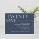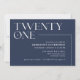Aniversário de 21 anos moderno convida com texto de cabeçalho "vinte e um" em letra de destaque. Design fora do centro com letra branca num fundo azul escuro contrastante.