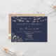 Casamento elegante, rústico, ouro rosa e azul marinho, tudo em um único convite, com luzes de cordas, cadarço floral dourado, site e código QR para RSVP no verso.